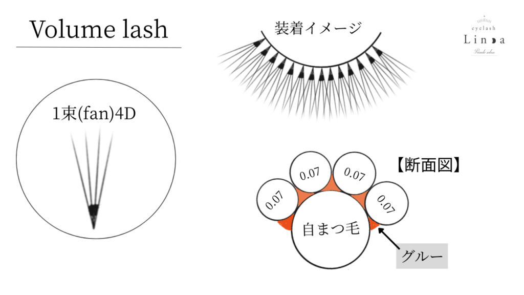 ボリュームラッシュは、束(fan)の根元の接着点が自まつ毛を包み込むようにフィットする構造のため、
